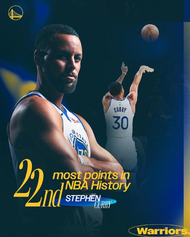 库里生涯常规赛总分超越飞人卡特,升至NBA历史第22位迎来里程碑,现役仅次于詹姆斯、杜兰特、哈登与威少位列第5位。