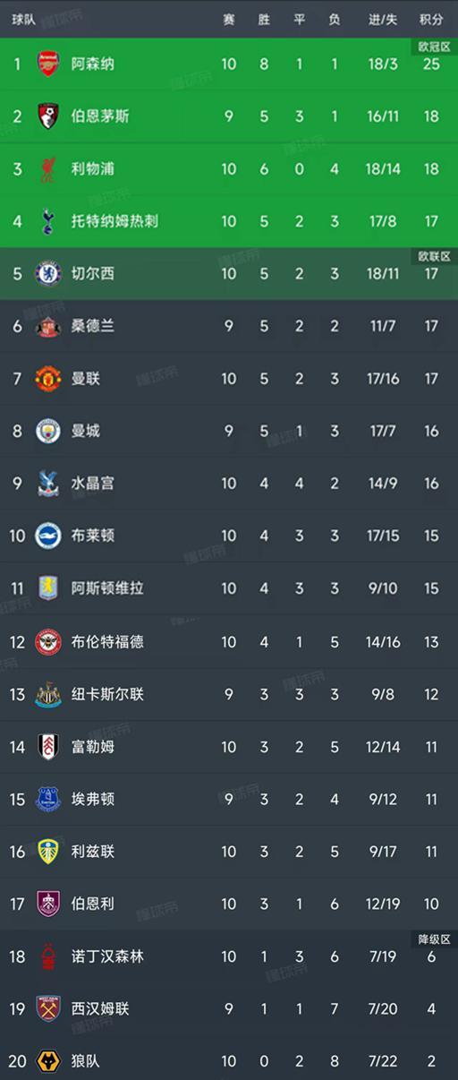 北京时间11月2日,英超第10轮结束了7场比赛,最新积分榜如下!
