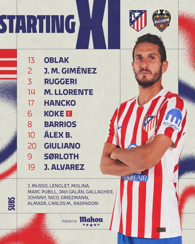 北京时间11月9日1:30,西甲第12轮,马竞主场对阵莱万特。赛前首发公布。